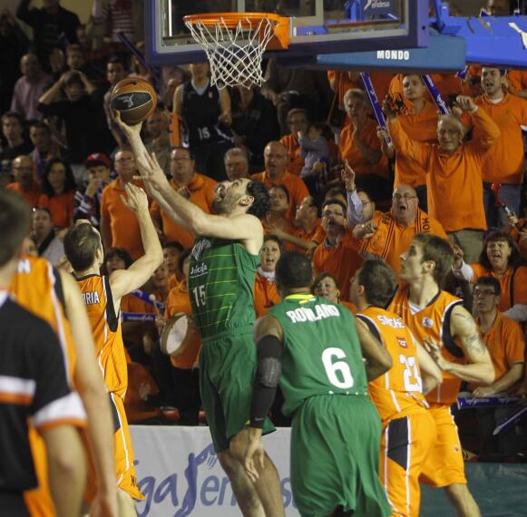 | Berni lanza ante Hasbrouck [Foto: Unicaja B. Fotopress/M. Pozo] |